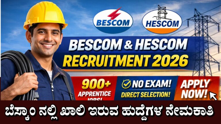 BESCOM & HESCOM Recruitment 2026 ಕರ್ನಾಟಕದಲ್ಲಿ ಸರ್ಕಾರಿ ಉದ್ಯೋಗದ ಕನಸು ಕಾಣುತ್ತಿರುವ ಸಾವಿರಾರು ಯುವಕರಿಗೆ 2026ರಲ್ಲಿ ದೊಡ್ಡ ಅವಕಾಶ ಒದಗಿದೆ. ರಾಜ್ಯದ ಪ್ರಮುಖ ವಿದ್ಯುತ್ ಸರಬರಾಜು …