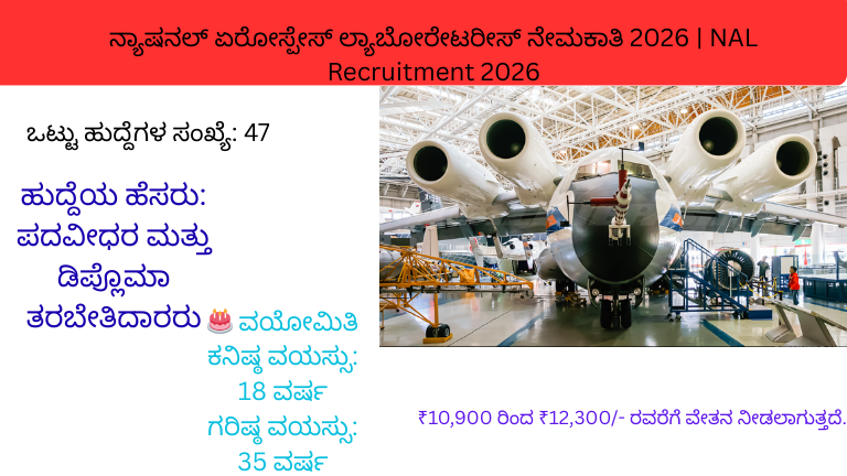 NAL Recruitment 2026 :ಬೆಂಗಳೂರು ನ್ಯಾಷನಲ್ ಏರೋಸ್ಪೇಸ್ ಲ್ಯಾಬೋರೇಟರೀಸ್ ನಲ್ಲಿ 47 ಹುದ್ದೆಗಳ ನೇಮಕಾತಿ – ಪರೀಕ್ಷೆ ಇಲ್ಲ